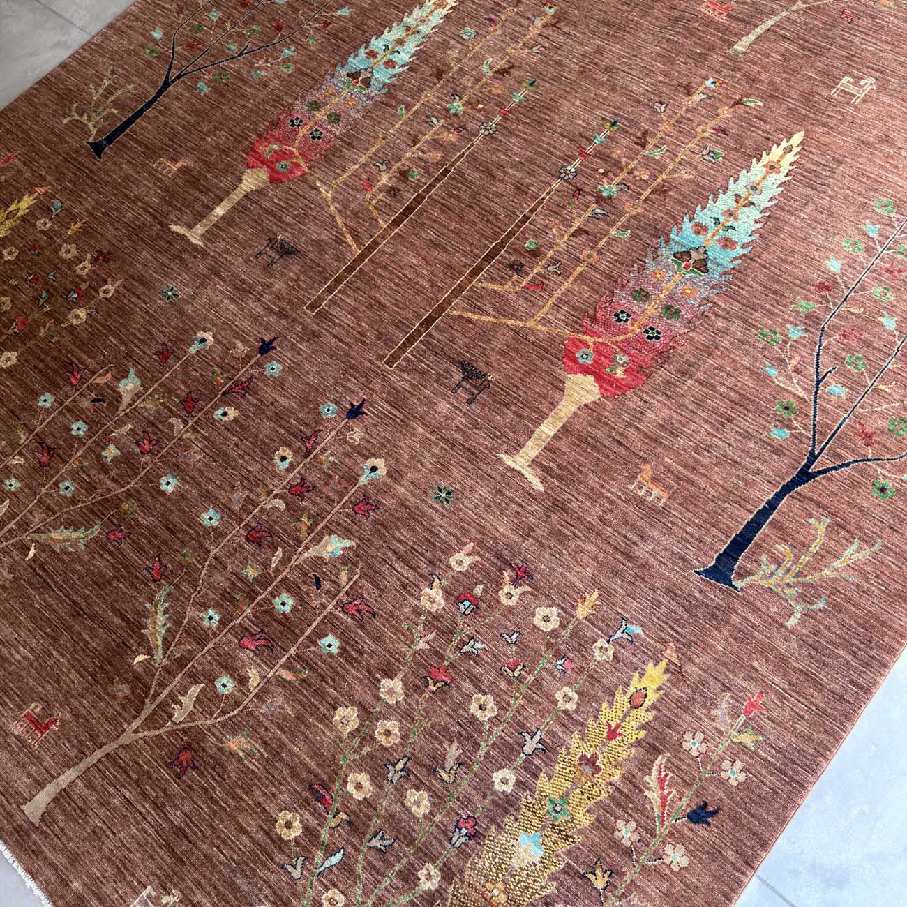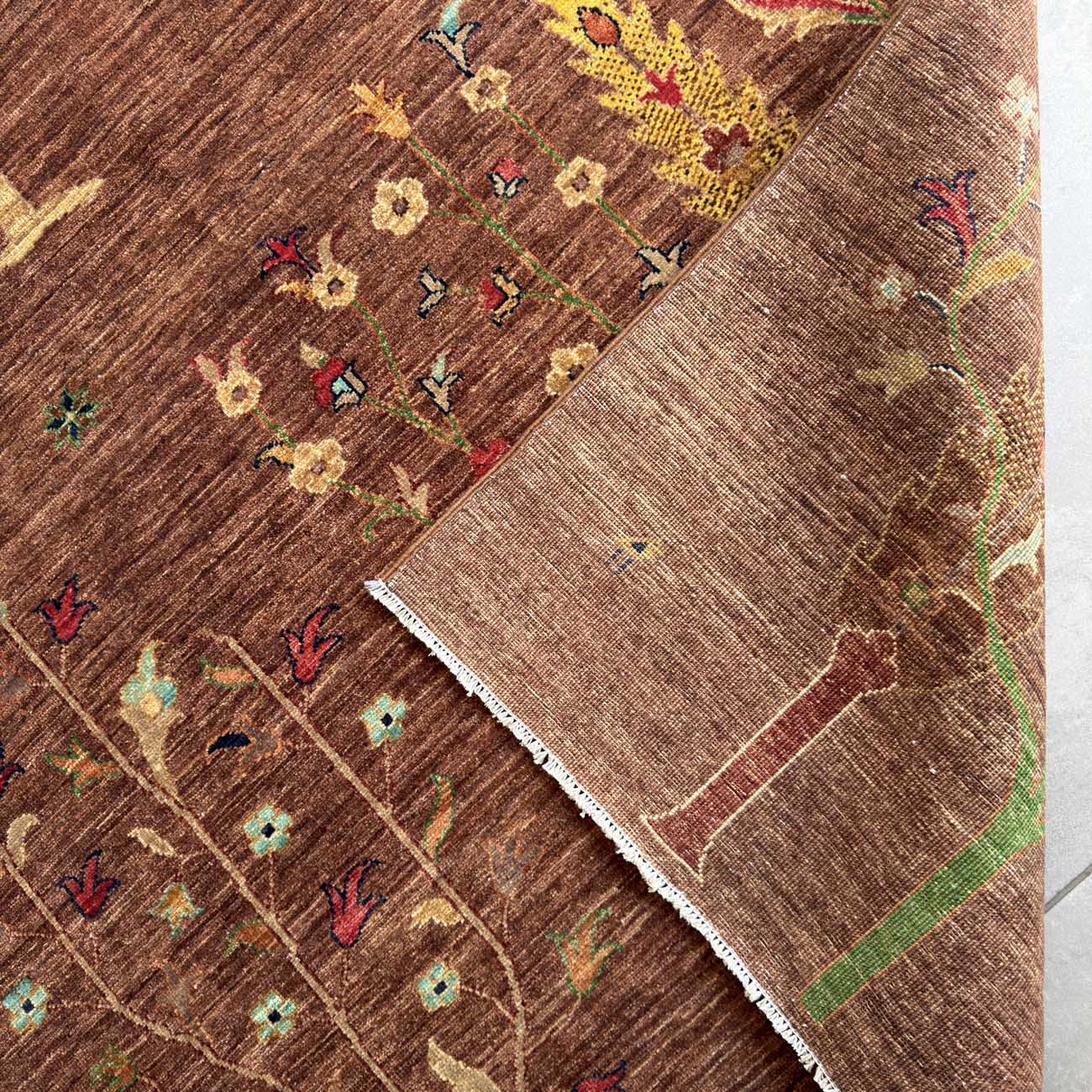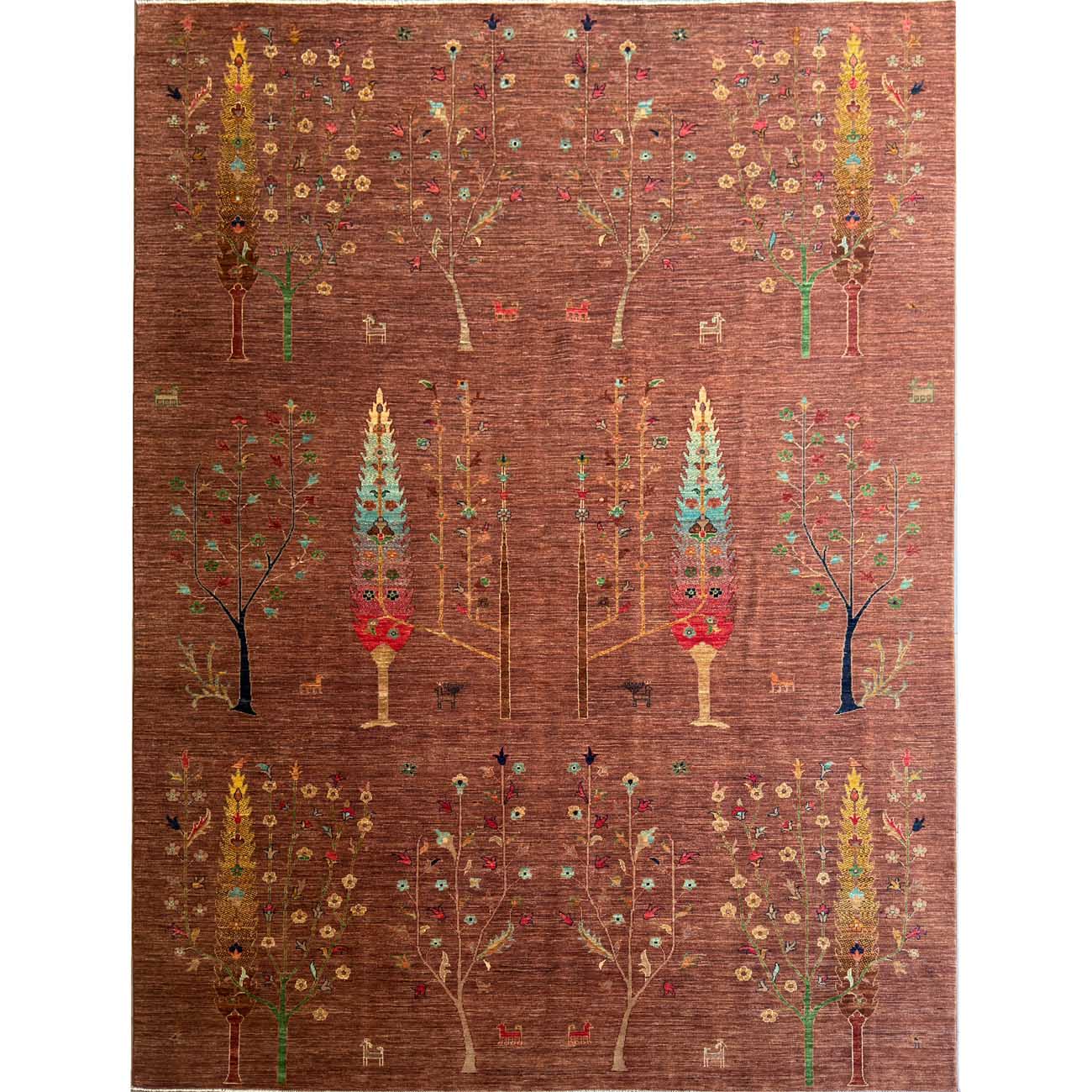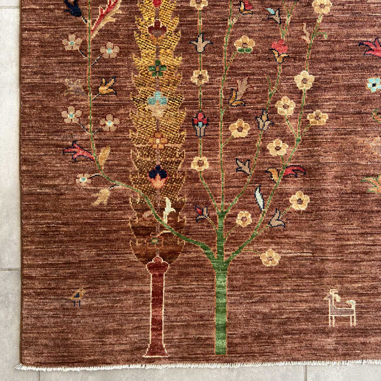El Dokuma Kahverengi Hayat Ağacı Yün Halı (250×335 cm)