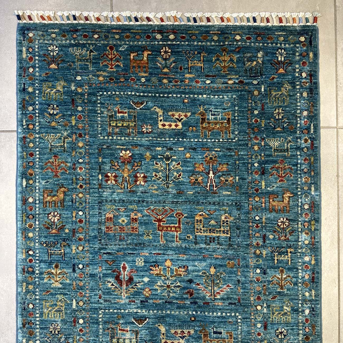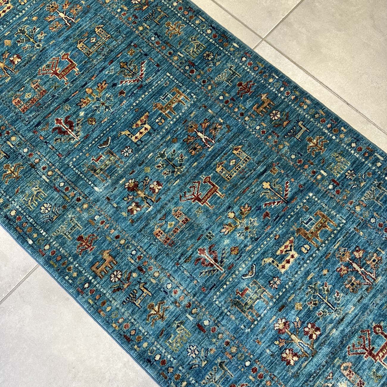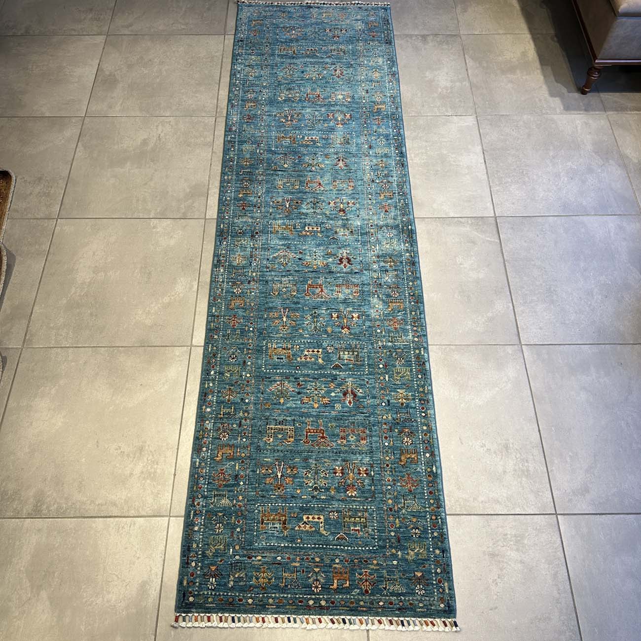 El Dokuma Turkuaz Figürlü Afgan Kabile Yün Yolluk Halı (85×300 cm)